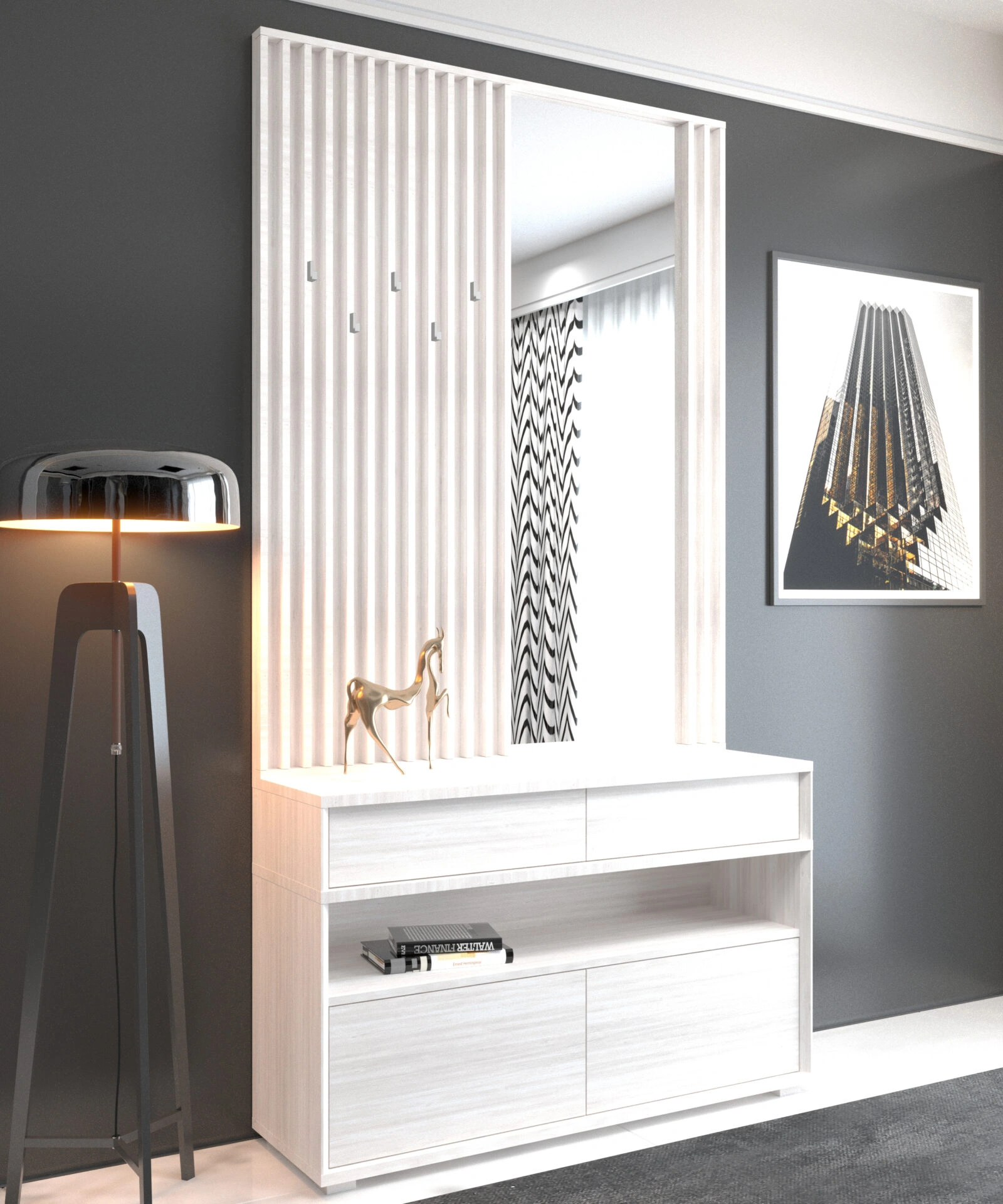 A delhi előszoba a modern funkcionalitás ötvözetét tükrözik. A bútorok nemcsak esztétikai szerepet töltenek be, hanem a napi élethez szükséges praktikusságot is biztosítják – például a kulcsok, kendők vagy táskák elhelyezésére szolgáló falra szerelt akasztókkal.