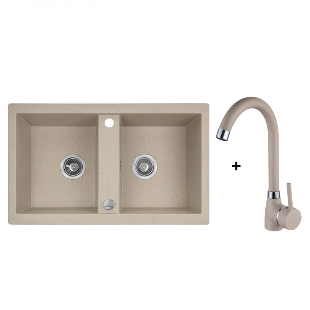 Laveo BARBADOS kétmedencés bézs szett álló csappal dugókiemelős helytakarékos szifonnal