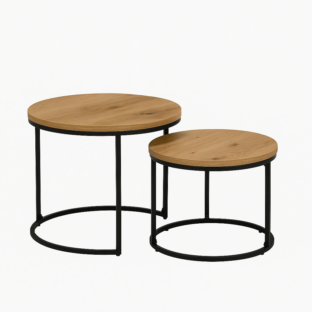 Ez a szett ideális megoldás, ha modern, mégis barátságos hangulatot szeretnél otthonodba. A két különböző méretű asztal sokoldalúan használható: egymás mellé téve elegáns középpontot alkotnak, különválasztva pedig praktikus kiegészítők lehetnek a nappali több pontján.